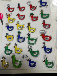 - Each duck displaying its own personality and phrase